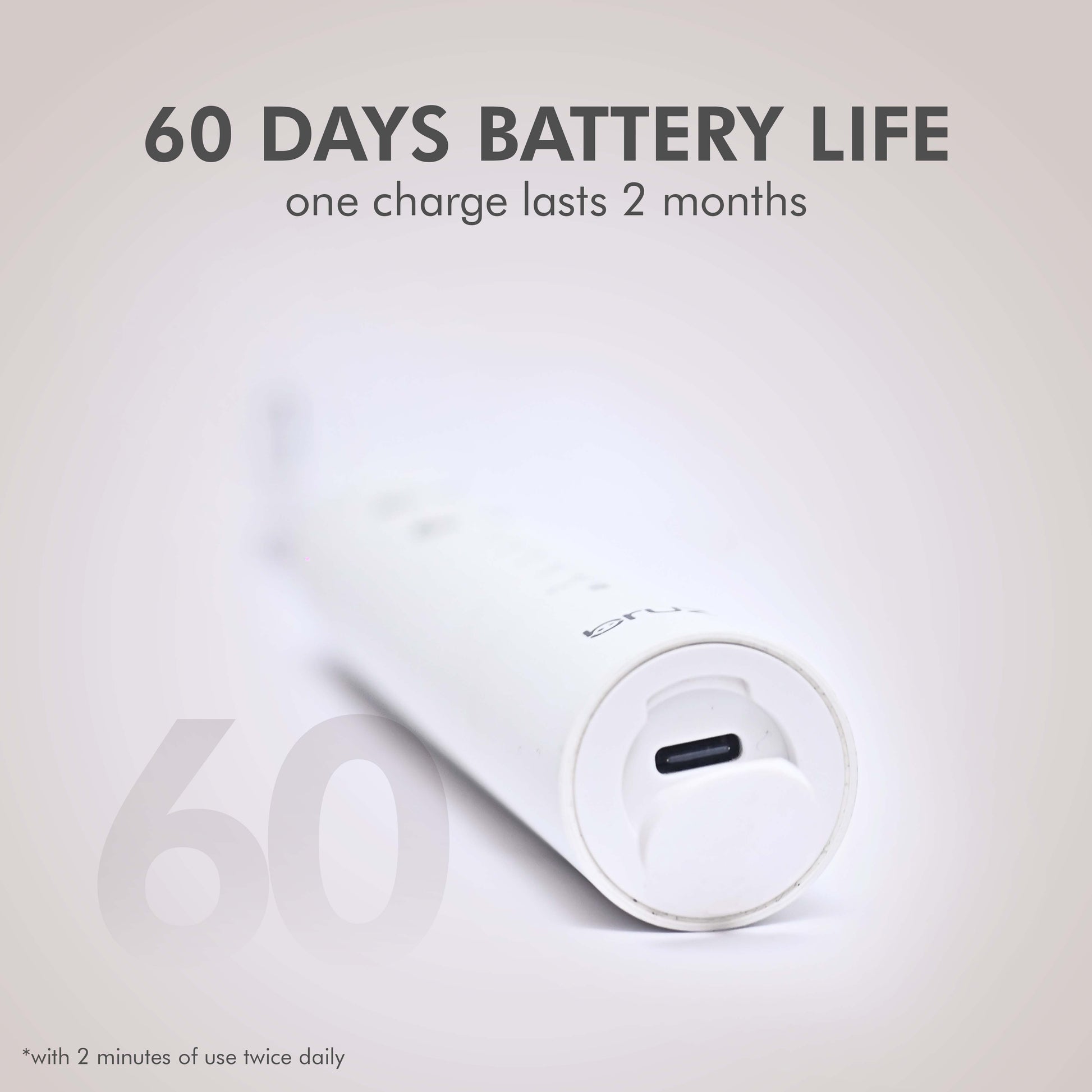 Incredibly convenient with its 60-day battery life on just 4 hours of charging, making it ideal for both daily use and travel. The package includes additional brush heads and a charging case. The White mode's 40,000 VPM effectively eliminates dental plaque, while the Polish mode's wide brush head provides thorough cleaning. The Milder mode is perfect for beginners, offering gentle yet effective cleaning, and the Sensitive mode provides lower intensity for sensitive teeth and first-time users.